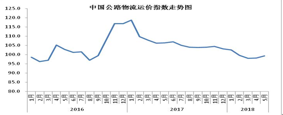 中國物流與采購聯(lián)合會(huì)發(fā)布的2018年5月份中國物流業(yè)景氣指數(shù)為56.1%,較上月回升1.5個(gè)百分點(diǎn);中國公路物流運(yùn)價(jià)指數(shù)為99.3點(diǎn),比上月回升1.13%。