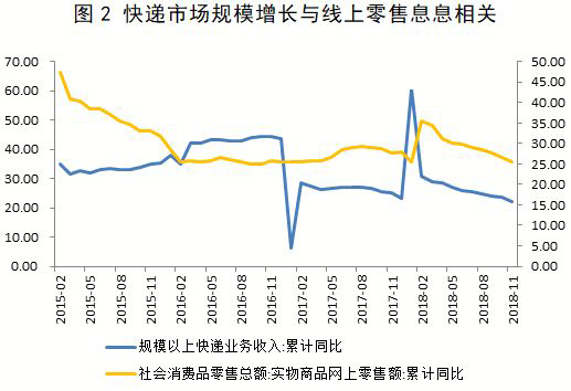 首先,快遞行業(yè)增長仍然較快。整個2018年,一共送出了505億件快遞,增長25.8%。截至2018年11月,快遞業(yè)收入達到5428億元,同比增長22.3%,當然這主要受益于線上零售的持續(xù)擴張(參見圖2)。不過,這樣的趨勢也隨著線上零售增速的下滑而有所減緩。這多少為快遞行業(yè)的發(fā)展蒙上了一層薄薄的陰影。