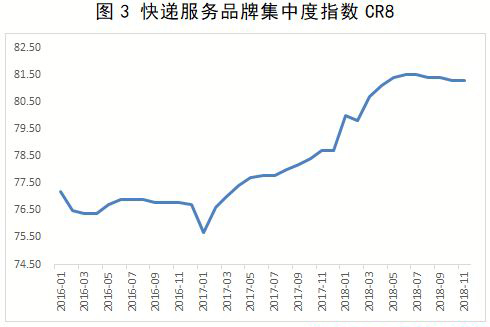 在激烈的競爭和日趨成熟的市場結構中,并購不可避免地發(fā)生了,同時市場也變得越來越集中。2016年以來,快遞服務品牌集中度指數(shù)CR8(市場中前八大企業(yè)的市場份額之和)持續(xù)上升,2018年的下半年達到了81.3(參見圖3)。