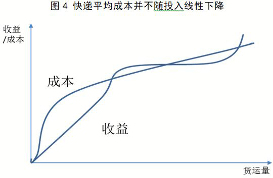 在此背景下,誰能夠在2019年更好地控制成本,誰就能夠成功攫取競爭優(yōu)勢。不過,面對快遞行業(yè)“曲折”的規(guī)模經(jīng)濟(參見圖4),想要獲得成本與收益的平衡,著實是件難事。在這些不確定性下,聰明(或者說有雄心)的快遞企業(yè)可尋找一條確定性道路,即繼續(xù)進行運力鋪設,最終將成本大幅度降至收益之下。