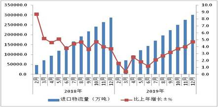 全球產(chǎn)業(yè)鏈地位繼續(xù)鞏固,進口物流量質(zhì)齊升。2019年我國貨物貿(mào)易規(guī)模邁上新臺階,全年貨物進出口總額31.5萬億元,增長3.4%,出口占國際市場份額穩(wěn)步提升,根據(jù)世界貿(mào)易組織統(tǒng)計,2019年前三季度我國出口增速比全球高2.8個百分點,國際市場份額比2018年提高0.3個百分點至13.1%。在此背景下,我國全球產(chǎn)業(yè)鏈的地位繼續(xù)鞏固,進口物流需求形勢總體良好,逐季回升,特別是12月進口總值更是創(chuàng)下月度歷史峰值。海關(guān)數(shù)據(jù)顯示,部分原材料和能源產(chǎn)品進口持續(xù)增加。2019年,我國進口鐵礦砂10.7億噸,增長0.5%;進口原油5.06億噸,增長9.5%;進口天然氣9656萬噸,增長6.9%;進口大豆8851萬噸,增長0.5%。此外,消費品、醫(yī)藥品進口分別增長19%和25.8%。