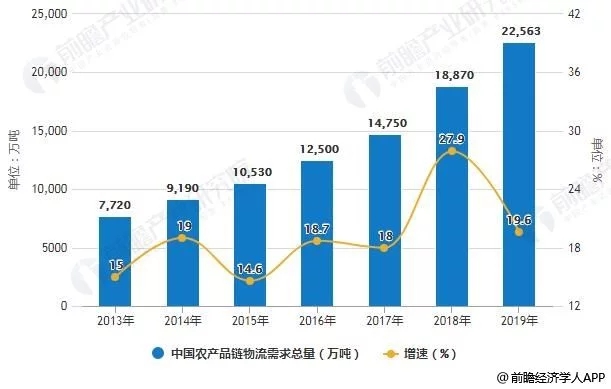 2013-2019年中國農產品鏈物流需求總量統計及增長情況預測