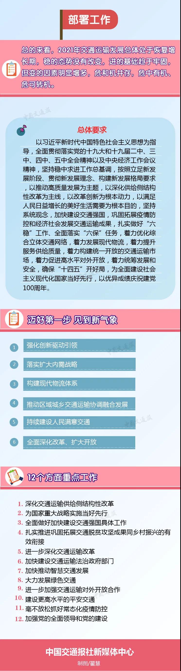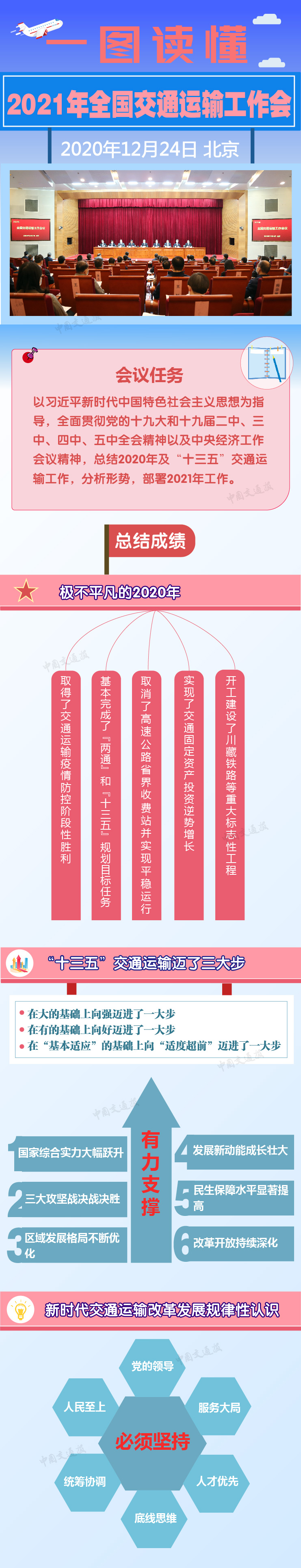 12月24日,2021年全國交通運輸工作會議召開。會議以習近平新時代中國特色社會主義思想為指導(dǎo),全面貫徹落實黨的十九大和十九屆二中、三中、四中、五中全會精神以及中央經(jīng)濟工作會議精神,總結(jié)2020年及“十三五”交通運輸工作,分析形勢,部署2021年工作,確?!笆奈濉遍_好局,為全面建設(shè)社會主義現(xiàn)代化國家當好先行,以優(yōu)異成績慶祝建黨100周年。交通運輸部黨組書記楊傳堂,部黨組副書記、部長李小鵬作工作部署。