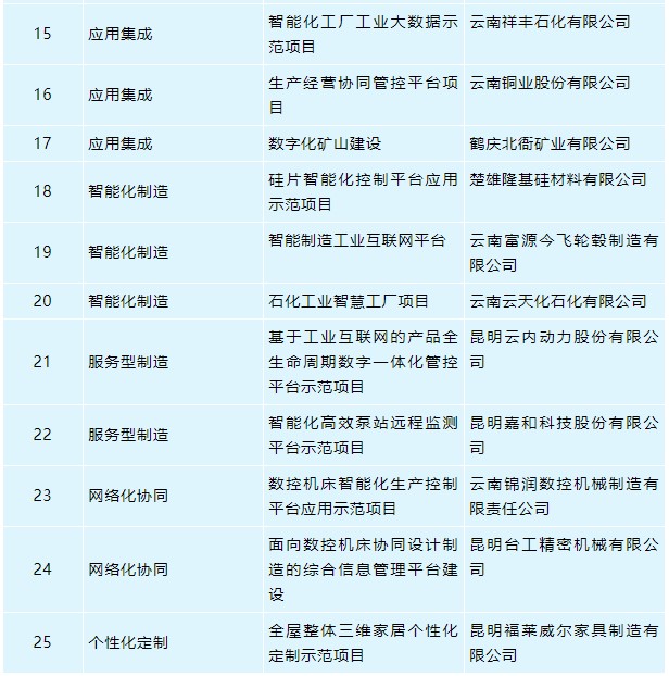 1月5日,云南省工業(yè)和信息化廳發(fā)布《關(guān)于2020年云南省工業(yè)互聯(lián)網(wǎng)試點(diǎn)示范項(xiàng)目名單的公示》,共有25個(gè)項(xiàng)目入選。