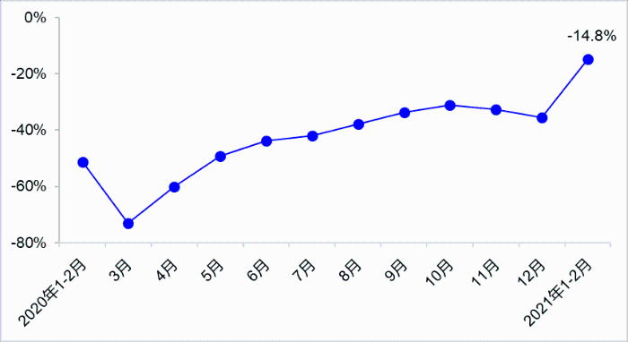 1—2月,完成營業(yè)性客運量12.4億人,比2020年同期、2019年同期分別下降14.8%和58.6%,其中公路營業(yè)性客運量比2020年同期下降19.2%,水路客運量比2020年同期增長20.7%。