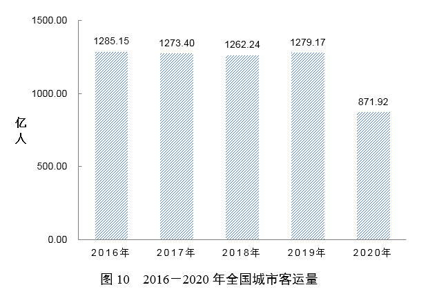 全年完成城市客運(yùn)量871.92億人,比上年下降31.8%。分方式看,公共汽電車客運(yùn)量442.36億人、運(yùn)營里程302.79億公里,分別下降36.1%和14.5%;軌道交通客運(yùn)量175.90億人,下降26.3%;巡游出租汽車客運(yùn)量253.27億人,下降27.2%;客運(yùn)輪渡客運(yùn)量0.39億人,下降47.1%。