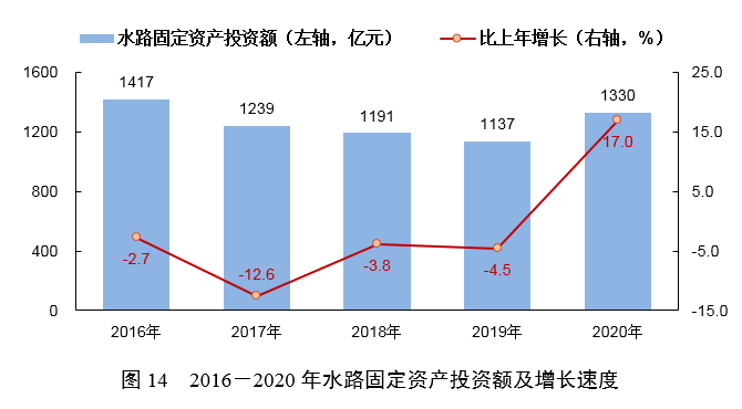 全年完成水路固定資產(chǎn)投資1330億元,比上年增長17.0%。其中,內(nèi)河完成704億元,增長14.8%;沿海完成626億元,增長19.5%。
