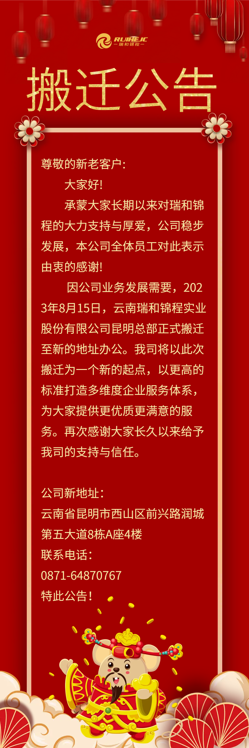新聞動(dòng)態(tài) 業(yè)務(wù)推介 黨建工會(huì) 電子刊物 公示公告 首頁 > 企業(yè)資訊 > 公示公告 搬遷公告 來源:瑞和錦程 瀏覽量:8724 日期:2023-08-15 下一篇:瑞和錦程關(guān)于申報(bào)首屆“云嶺慈善獎(jiǎng)”的公示